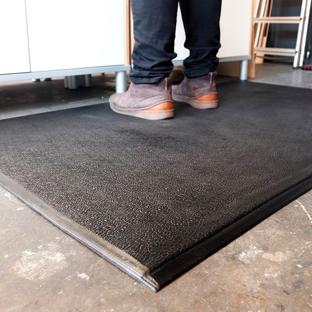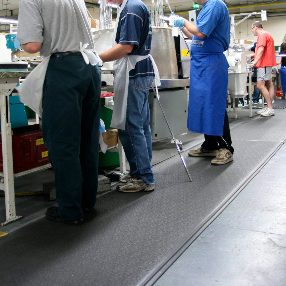 Alfombra que alivia la fatiga de los trabajadores que realizan tareas de pie y en movimiento.