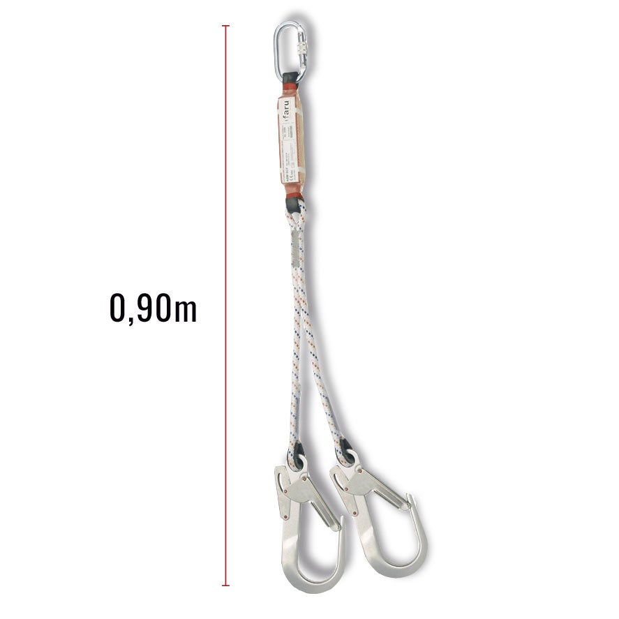 Elemento de amarre anticaídas de 90 cm con absorbedor de energía y gancho conector. Cuerda de seguridad de ø10.5 mm, apertura de conector ø 50 mm y mosquetón de virola. Longitud de trabajo del equipo 0.90 m.