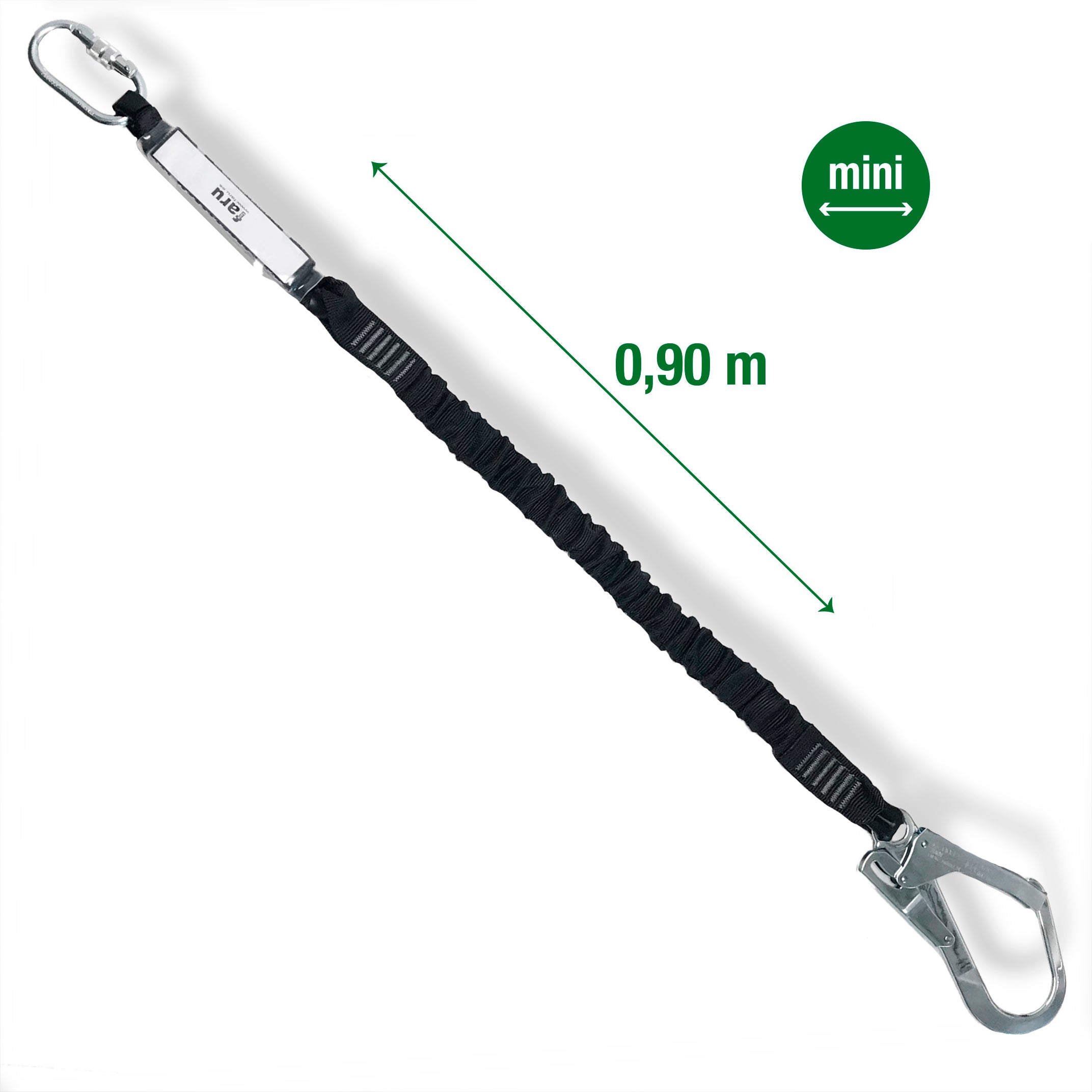 Anticaídas con absorbedor de energía de elongación reducida (elongación máxima 0,7m). Posee cinta elástica, un gancho de acero ø 50mm y un mosquetón de virola. Longitud de todo el equipo 0,9 m.