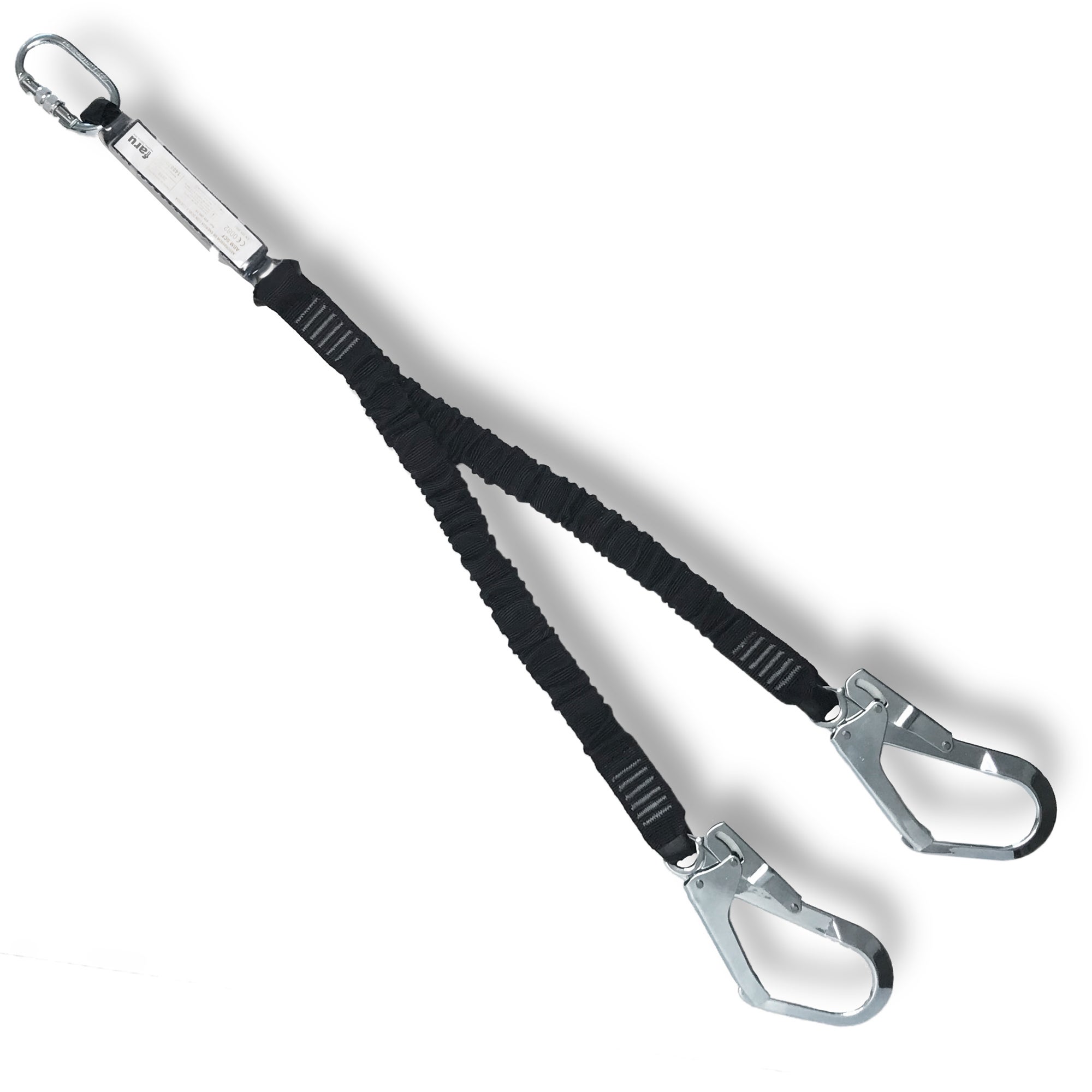 Anticaídas con absorbedor de energía de elongación reducida (elongación máxima 0,7m). Posee 2 cintas elásticas, 2 ganchos de acero ø 50mm y un mosquetón de virola. Longitud de todo el equipo 1,5 m.