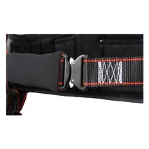 Arnés con hebillas, conectores y parte metálicas aisladas para electricistas.