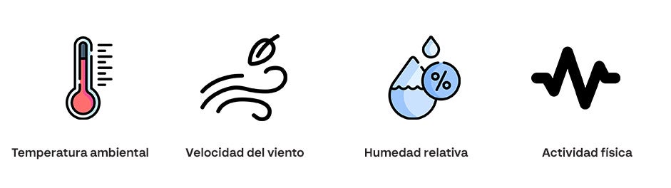 - Humedad relativa: el agua conduce el calor 25 veces más rápido que el aire, por lo que, a mayor humedad presente, mayor disipación de calor.