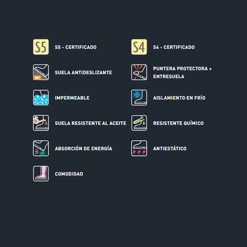 Otras de las características incluyen: resistencia al deslizamiento, propiedades antiestáticas, absorción de impactos en la zona del talón y resistencia al fueloil. Las botas son probadas y certificadas de acuerdo con la norma EN ISO 20345:2011.