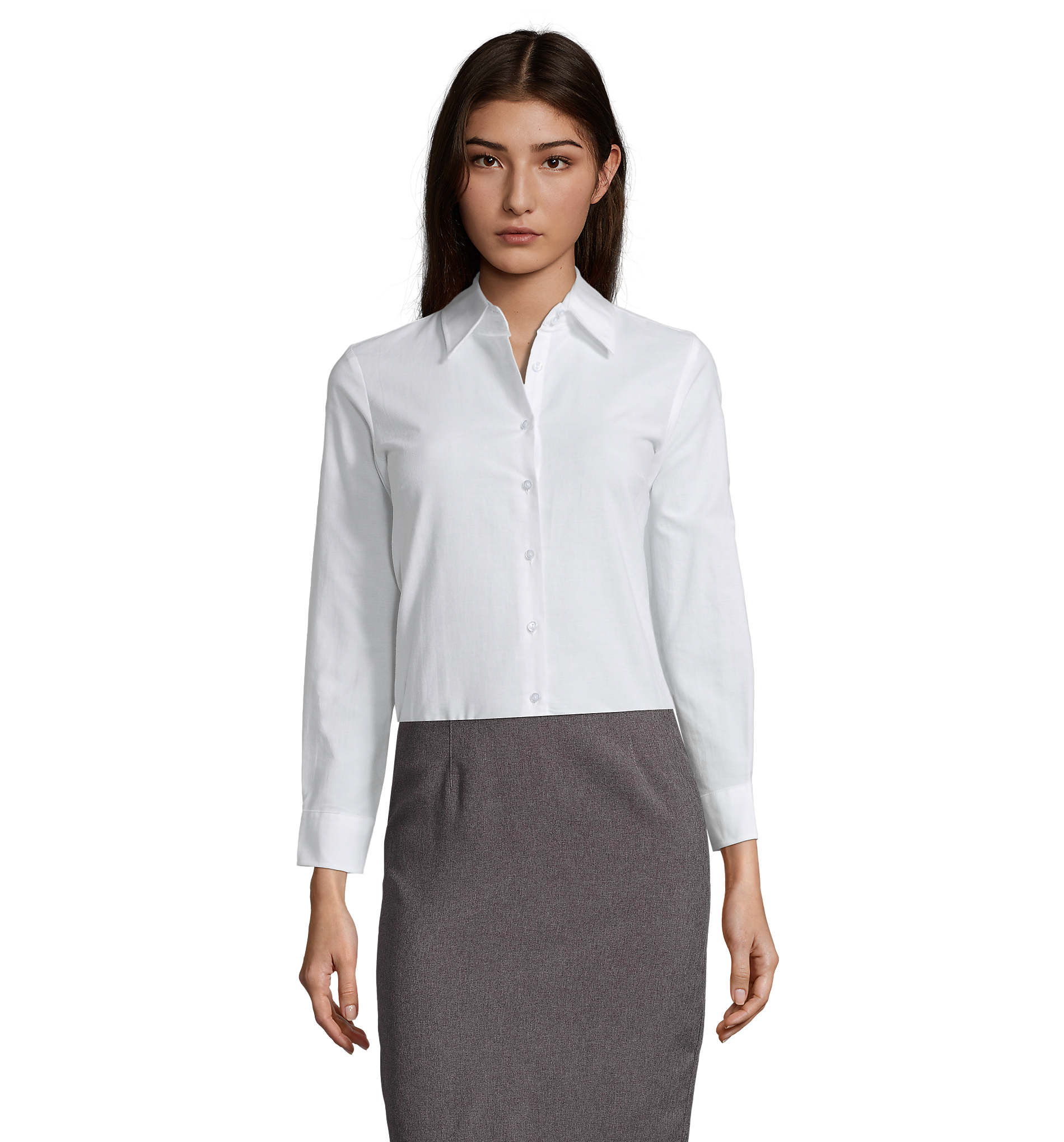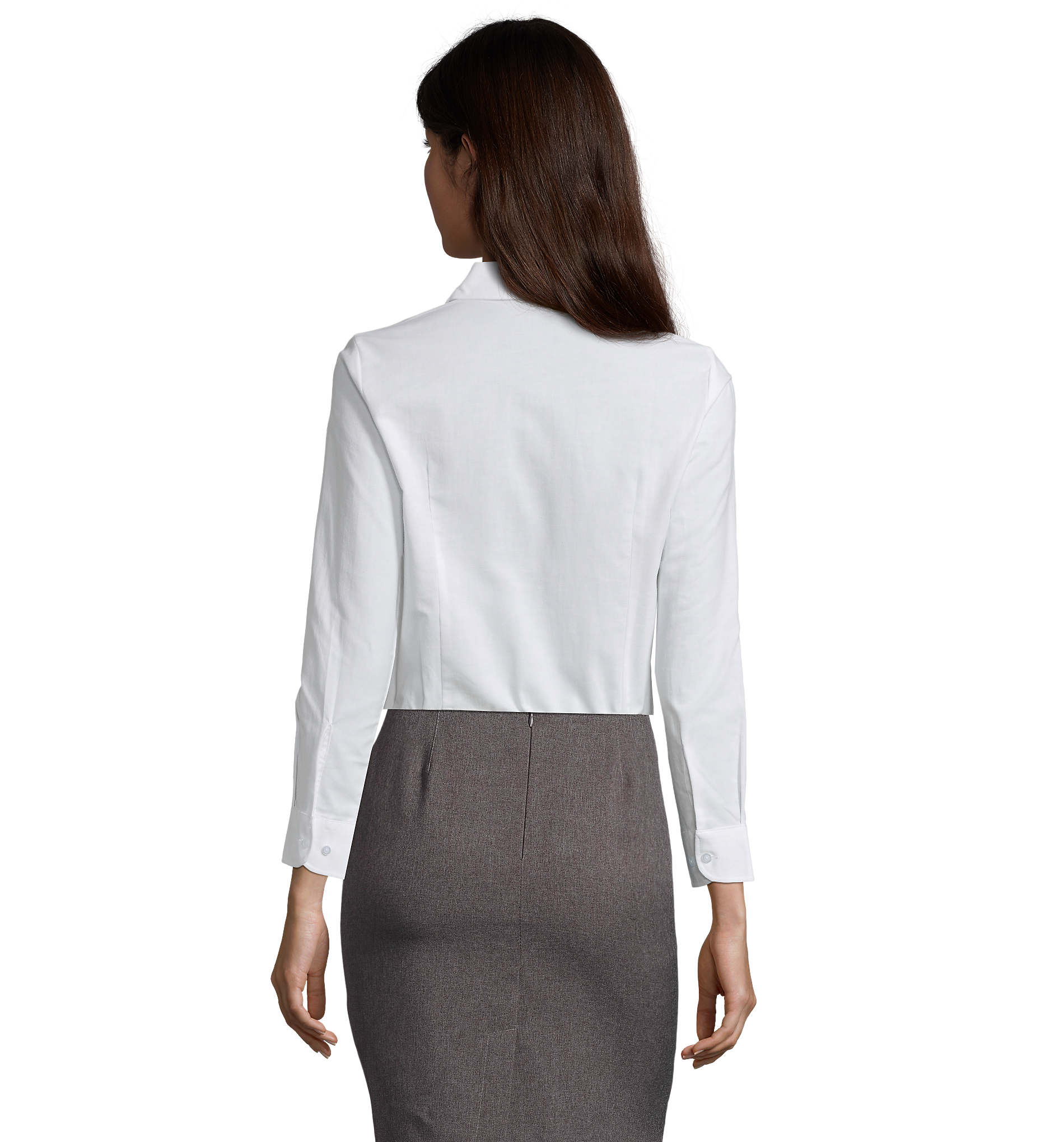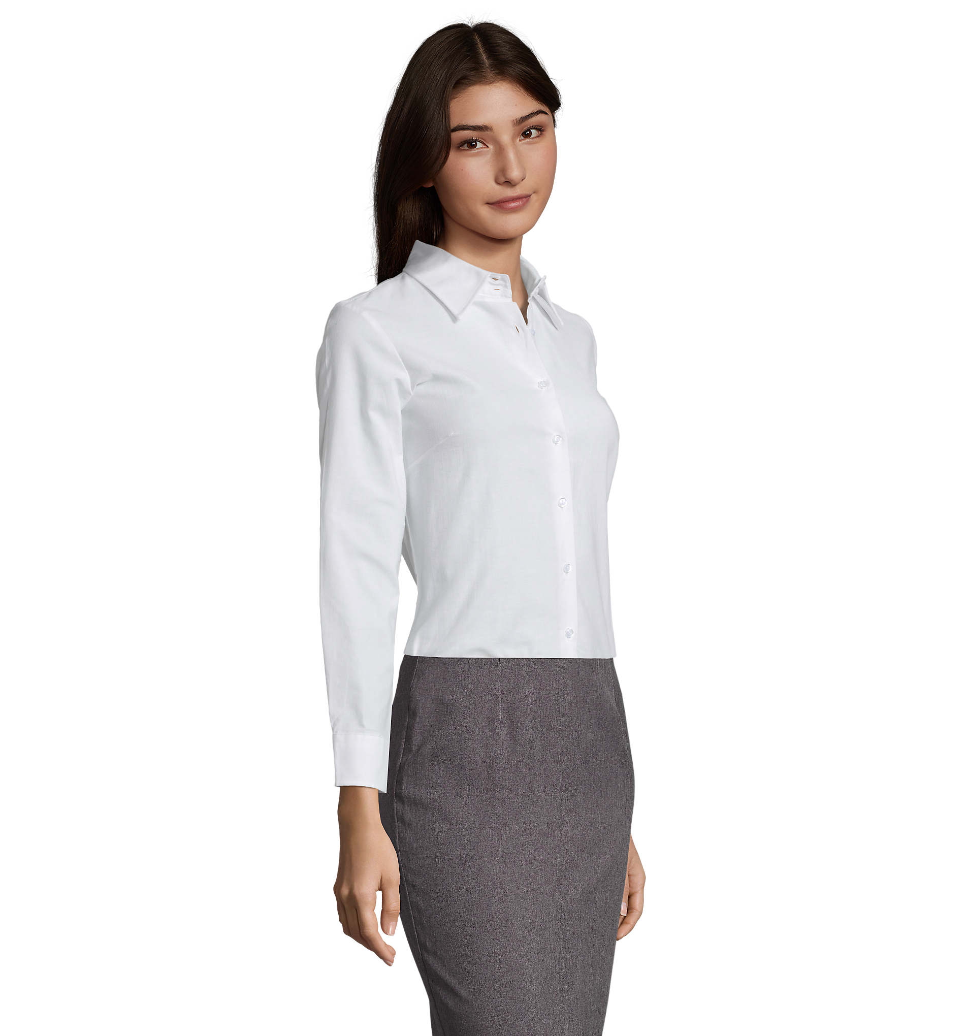 Camisa de manga larga de corte ajustado para mujer. Cuello clásico reforzado con 2 botones a juego.