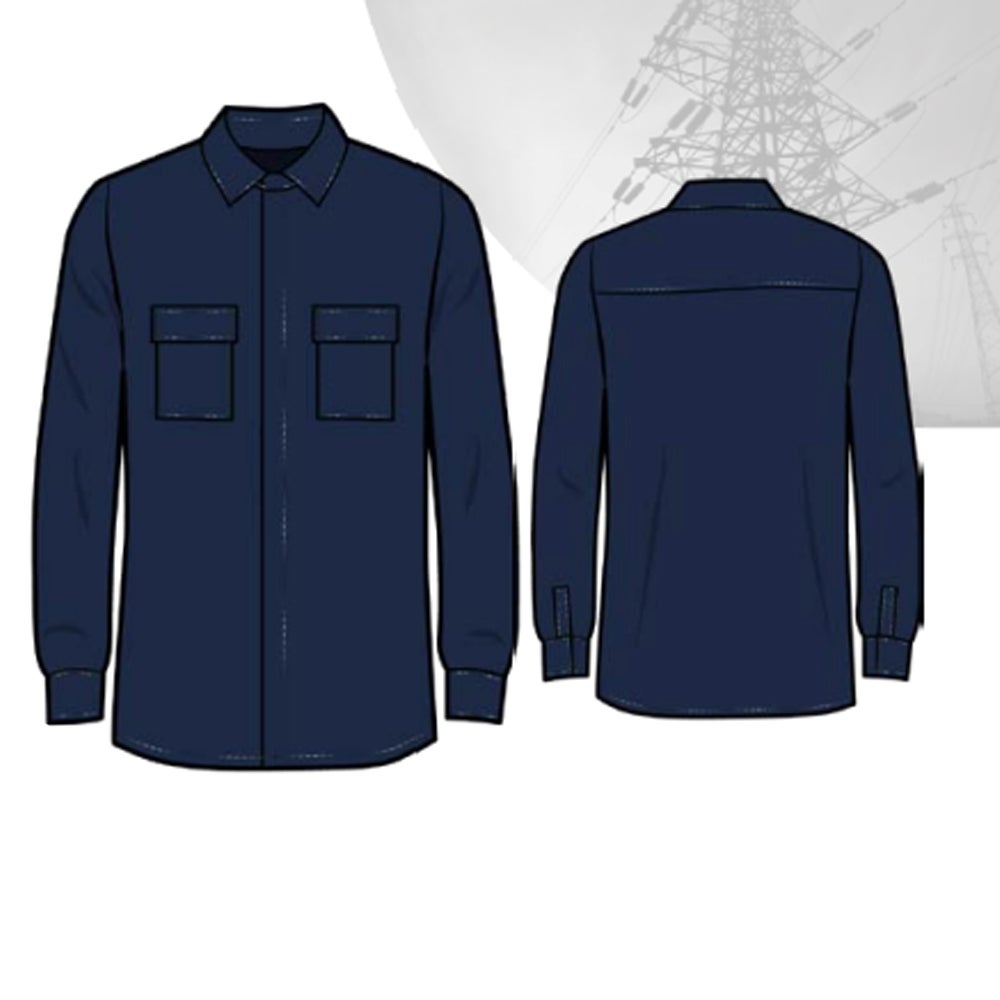 Camisa ignífuga azul marino con cuello camisero. Cierre central mediante botón oculto.
