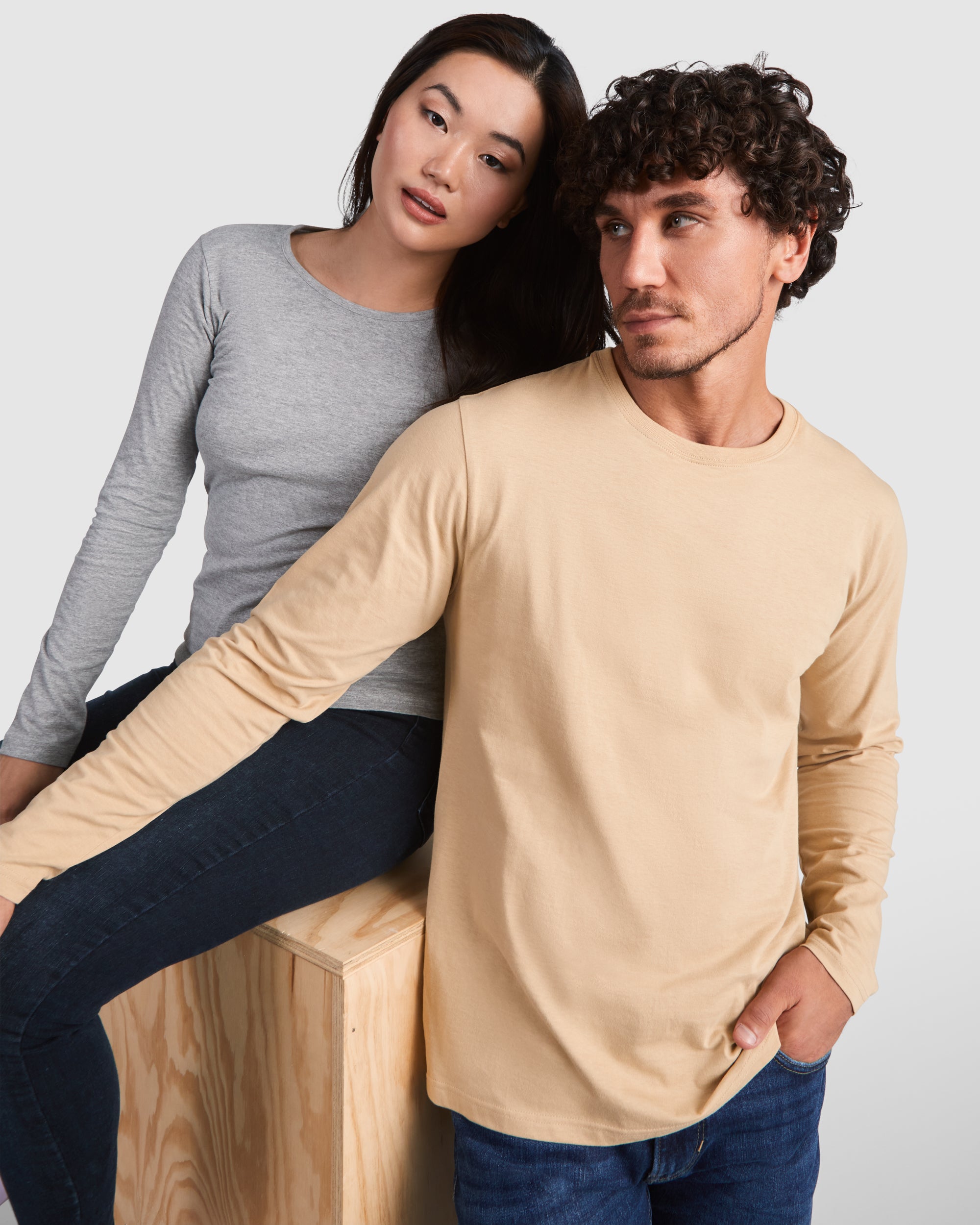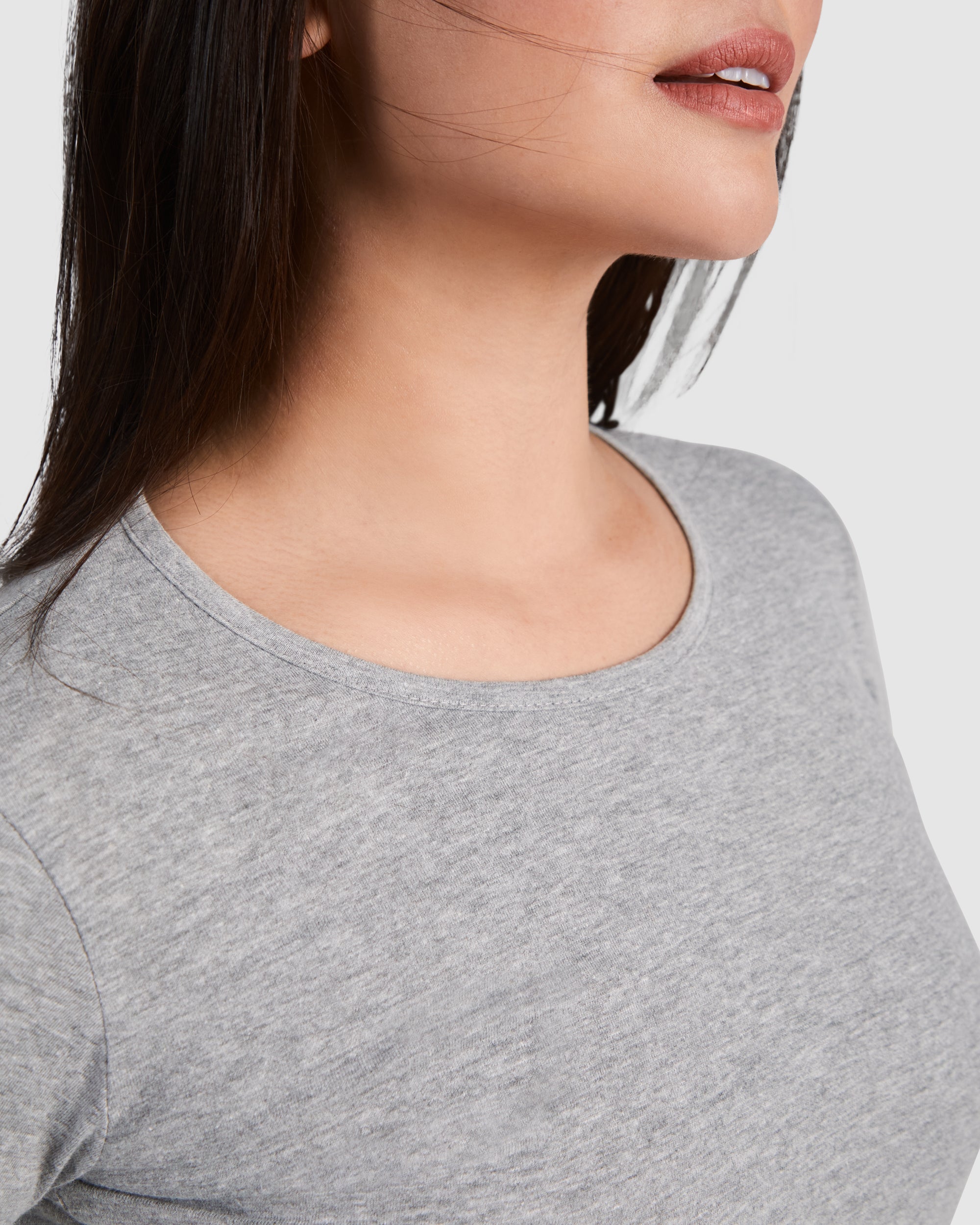 Camiseta semientallada, de manga larga y cuello acabado con ribete fino. Sin puños. Costuras laterales.