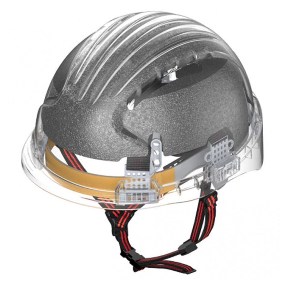 Casco de seguridad JSP EVO®5 DualSwitch™ ventilado, único en el mercado puesto que tiene un sistema para intercambiar normativas. Accionando la pestaña que tiene integrada en el barboquejo pasamos de la normativa de cascos de seguridad para la industria (EN397) a la normativa de cascos para escalada y rescate (EN12492). Incluye en su interior una carcasa de polipropileno expandido que garantiza una protección contra los impactos laterales, frontales y posteriores tal como exige la norma EN12492. La parte exterior es de ABS muy robusta y ligera, con ranuras universales para accesorios (protectores auditivos, pantallas faciales, etc.)
