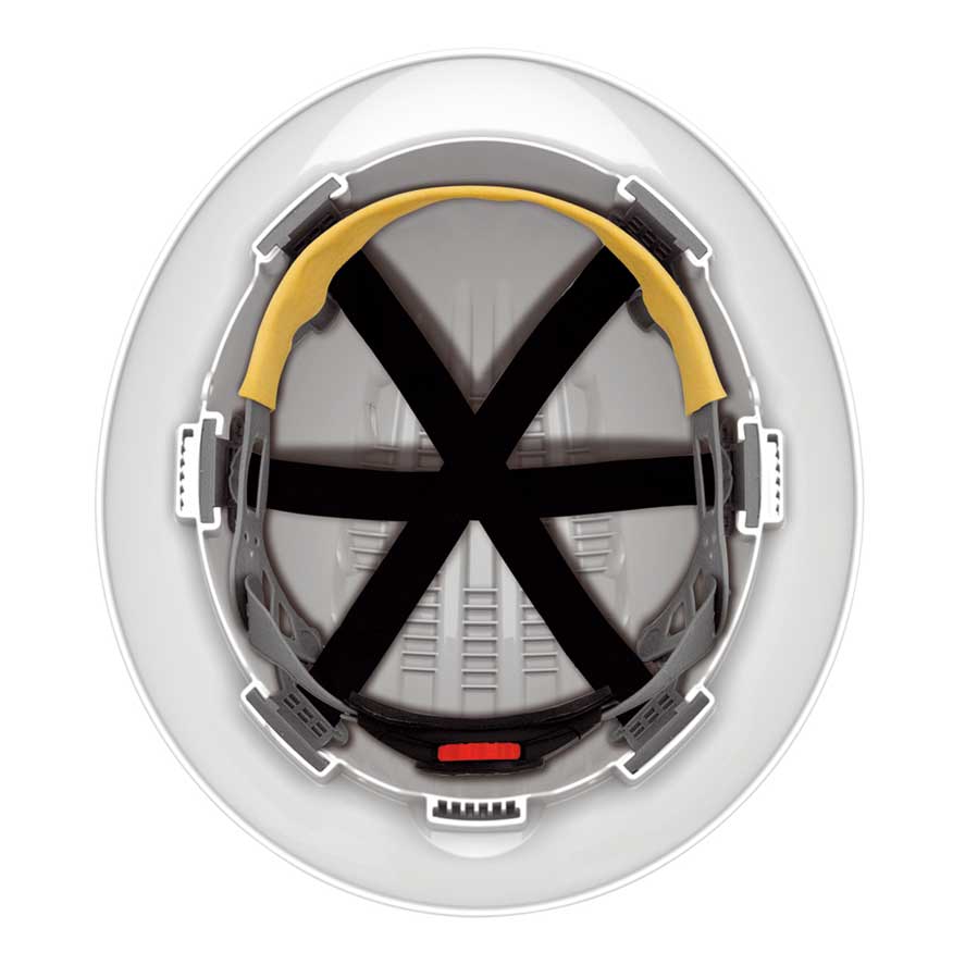 Casco no ventilado de polietileno de alta densidad (HDPE) con ala completa y ajuste de ruleta. Sudadera Chamlon: hecha de algodón egipcio con un revestimiento de PU de absorción máxima. Arnés textil con cintas de poliéster.