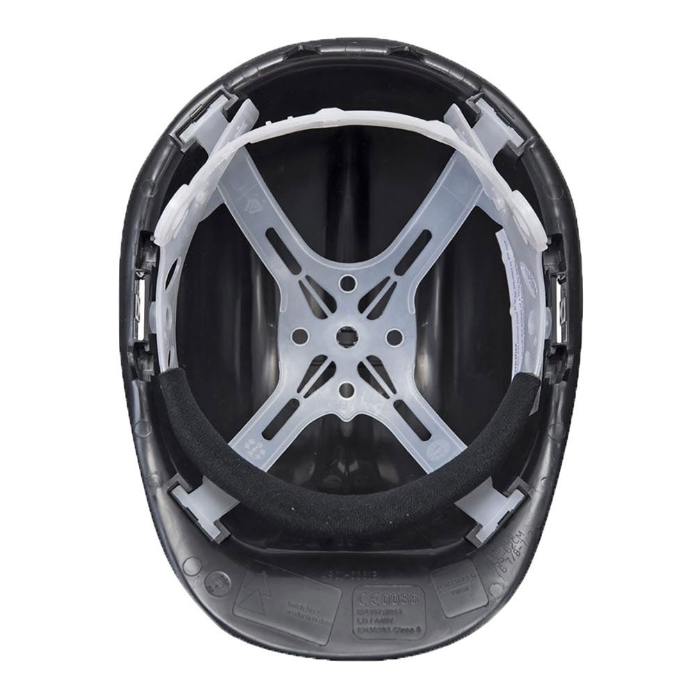 Casco de polipropileno de alta densidad, con arnés de suspensión de plástico, de 4 puntos. Hebilla ajustable, talla 55-62cm. Suave banda para el sudor incluida.