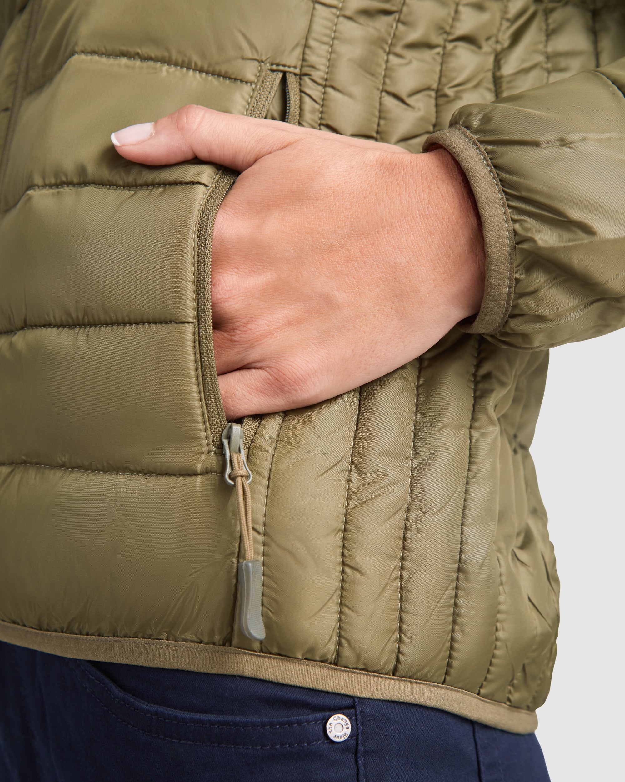 Chaqueta de mujer acolchada con relleno tacto pluma. Cremalleras invertidas a tono con protector de barbilla y tirador.