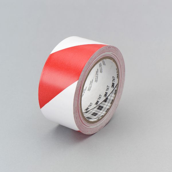 Cinta de Viniol Roja/Blanca 767, de dimensiones 33 m x 50 mm y 0,125 mm de espesor con franjas rojas y blancas y adhesivo de hule-resina. Es utilizada en aplicaciones no críticas como marcaje de equipo y áreas.