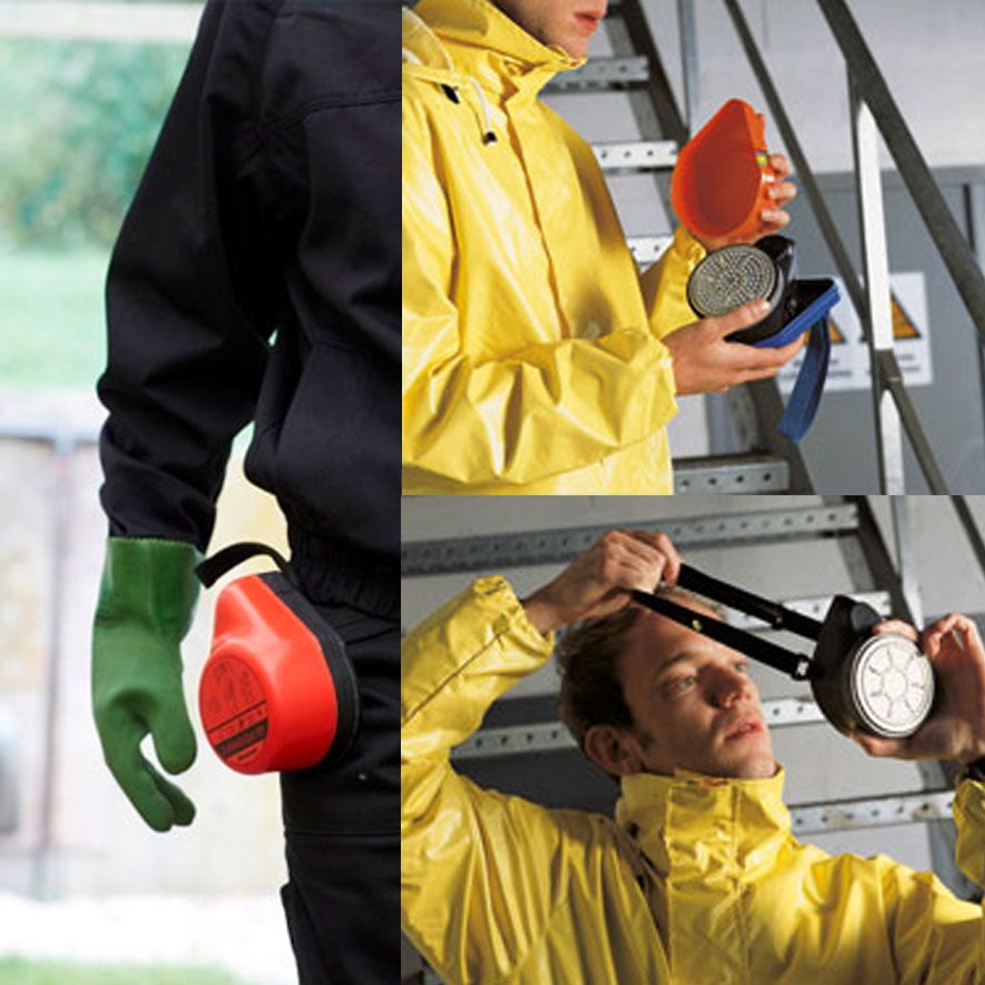 Semimáscara de filtración para 15 min de evacuación en entornos químicos. Práctica, sencilla y segura de usar. Compacta y ligera para llevarla fácilmente en un cinturón.
