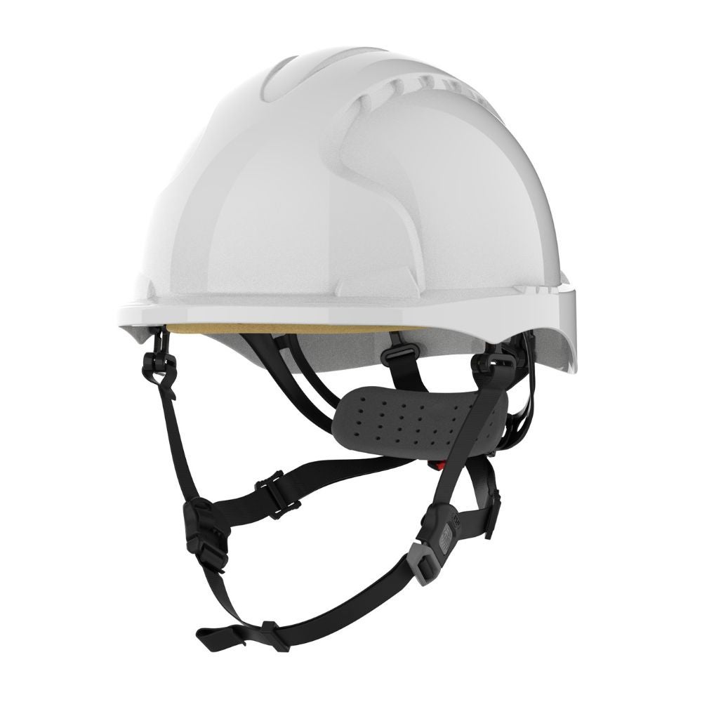 Casco de visera corta, no ventilado de polietileno de alta densidad, con ajuste de ruleta y barboquejo Linesman de 4 puntos. Banda de sudoración de cuero Nomaz. Con ranura universal. Ajuste muy confortable. Arnés textil con cintas de poliéster. Permite colocar el logo de la empresa.