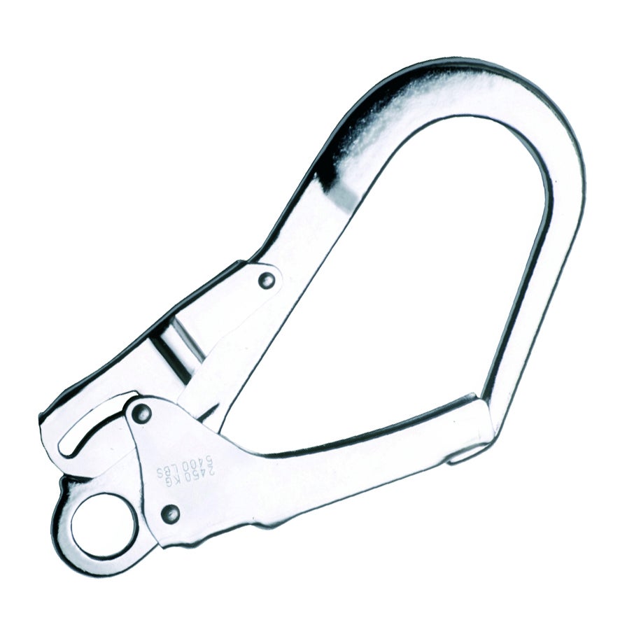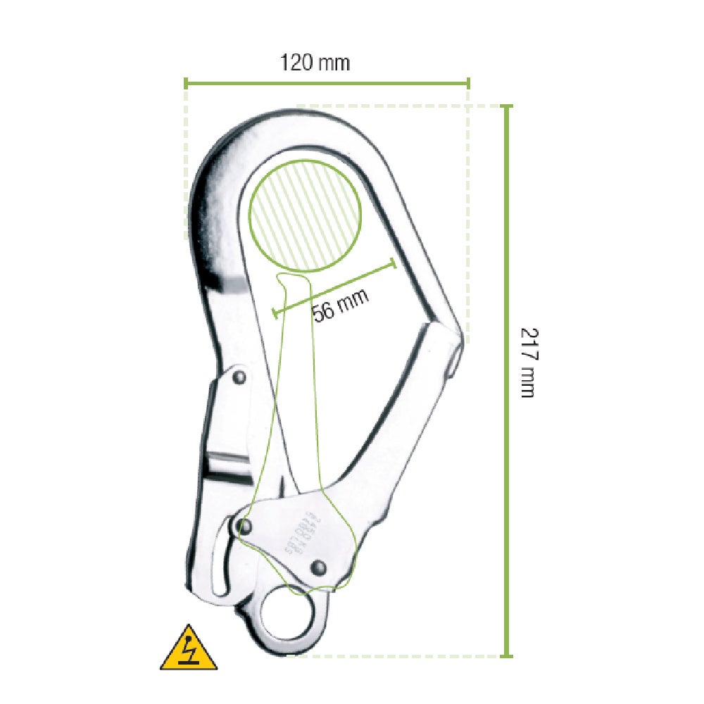 Gancho de seguridad de acero galvanizado con cierre automático de doble sistema. Especialmente apropiado para conectar a cables, cuerdas, y tubos de mayor diámetro. Fuerza máx. de trabajo: 23 kN. Dimensiones: 220 x 120 mm, apertura 50 mm. Peso: 500g.