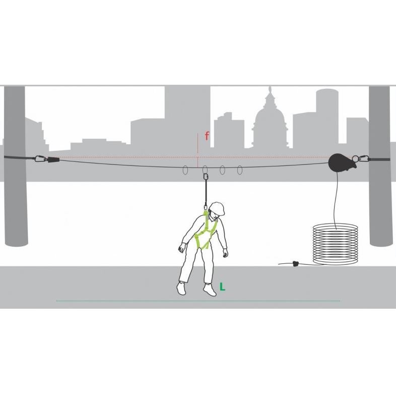 - Cuerda trenzada (16 mm diám.) equipada con tensor de diseño específico que permite ajustar la tensión de la línea de vida entre dos soportes.