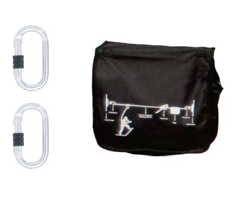 - Provista con 2 mosquetones de acero de bloqueo automático triple acción con una apertura de 21 mm y una mochilla de transporte.