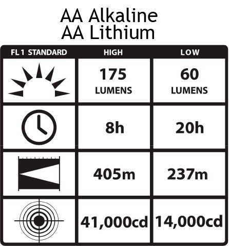 Posicion baja: luz brillante y tiempo de ejecución más largo: 14.000 candelas; 60 lúmenes; distancia haz 237m; dura 20 horas (AA alcalinas or AA litio).