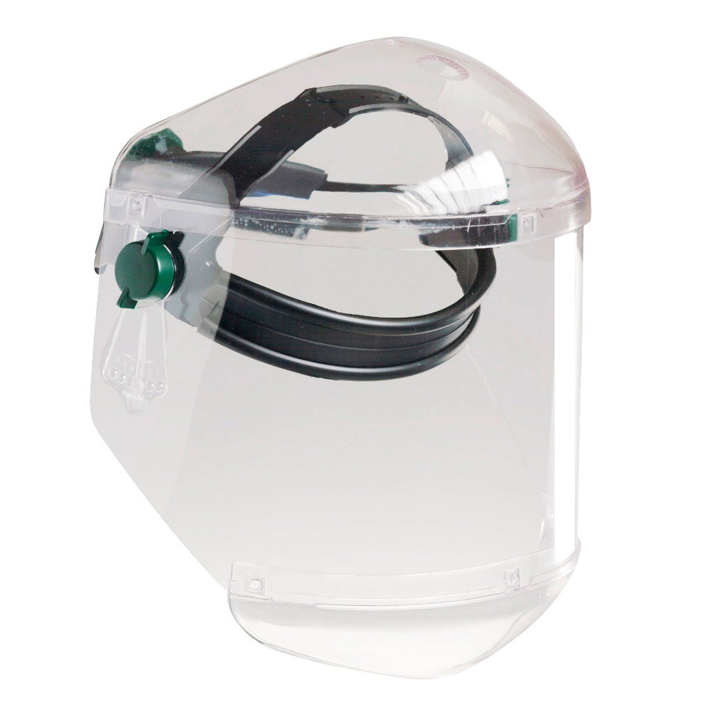 Combinación de protector de cara y barbilla con un resistente protector frontal. Dispone de arnés de cabeza ajustable. Pantalla abatible para cualquier uso industrial. Resistente visor con una amplia área de cobertura y visión