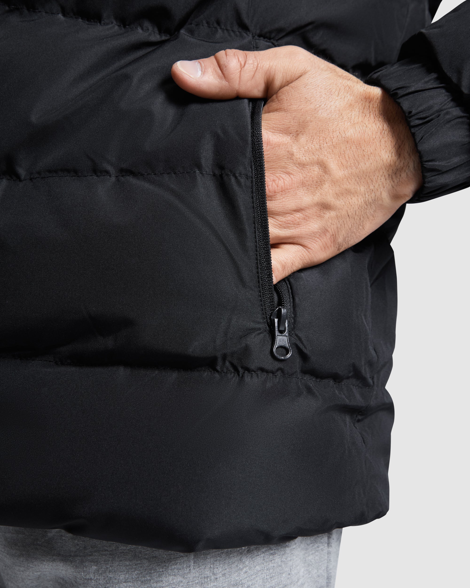 • Cremallera frontal a tono con doble tirador y protector de barbilla.