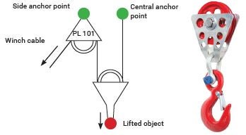 Polea para trípodes, apta para cable de acero y cuerda. En combinación con algunos winches permite aumentar la carga de elevación admitida.