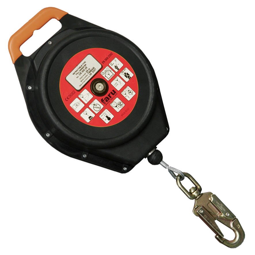 Dispositivo retráctil con cable de acero de 20 m y de 4 mm de diámetro y anillo de acero inóxidable para proteger la carcasa. Absorbedor de energía interno. Carcasa plástica con dimensiones: 260 x 120 x 340 mm. Peso máximo admitido: 140 Kg. Admite uso horizontal con accesorio PZ800