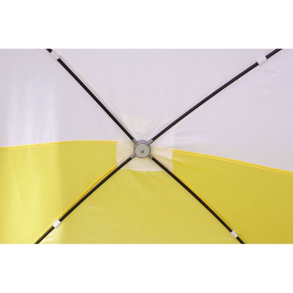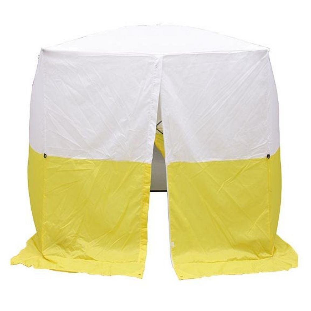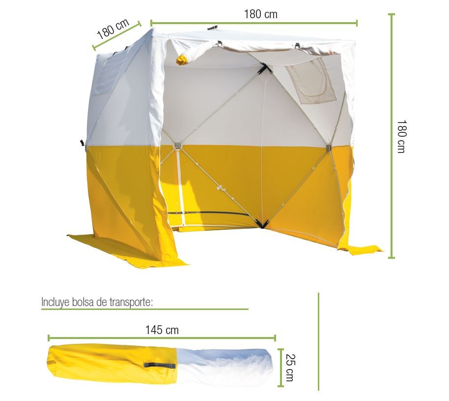 Tienda de rapido montaje (40s) y desmontaje (40s). Colores blanco y alta visibilidad. Ventanas laterales en dos lados. Dimensiones montada: 175 x 175 cm. Dimensiones plegada: 133 x 30 cm . Su propósito es de privacidad y para proteger a los trabajadores de las inclemencias del tiempo.