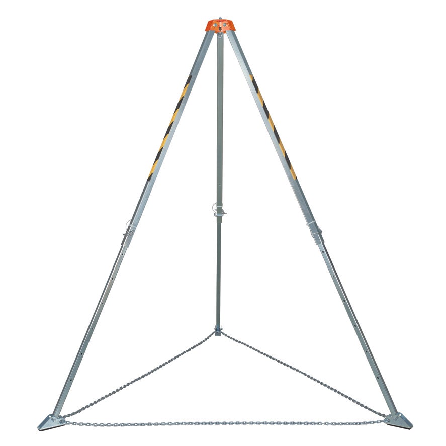 Máximo 1 persona, Altura 147-229 cm. Acero. Cabeza con 4 puntos de anclaje. Pies antideslizante. Patas con cinta. Altura: 147-229 cm. Diámetro de apertura bajo trípode: 140-213 cm. Distancia entre pies: 119-182 cm. Existe un modelo para elevar cargas de hasta 1.000 kg (consultar).