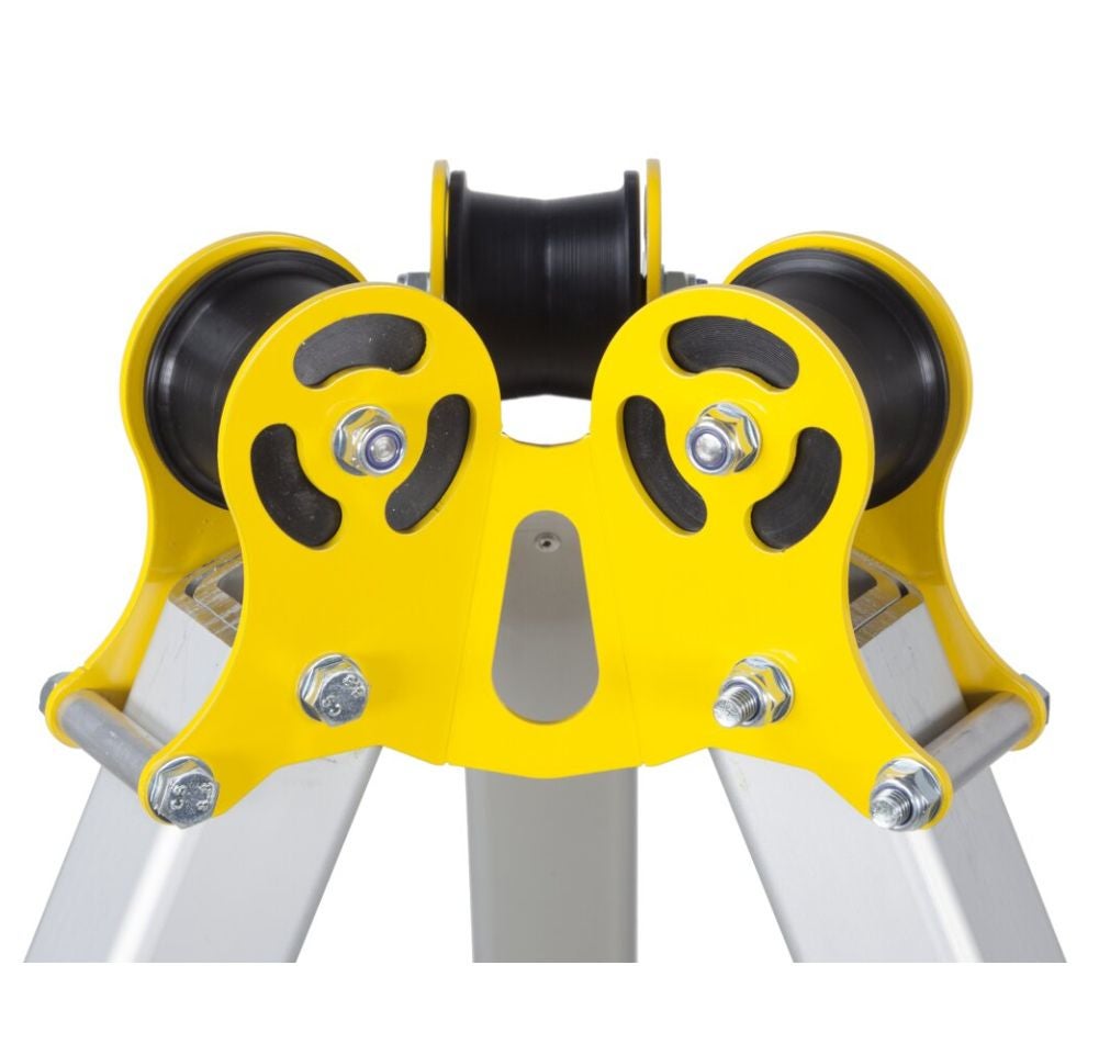 El trípode TM9-N consta de una cabeza de acero con recubrimiento de pintura en polvo, equipada con 3 poleas de poliamida con cojinetes de bolas para guiar la cuerda de trabajo de los dispositivos de las series RUP y CRW.
