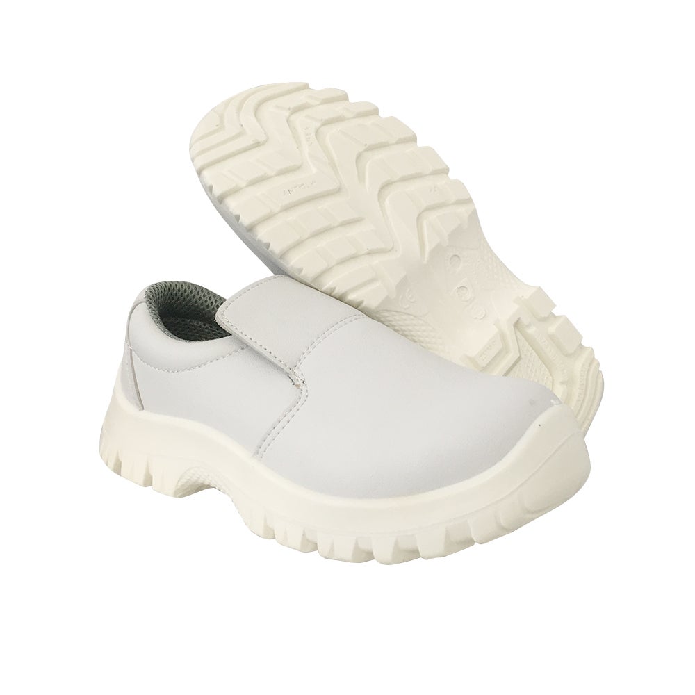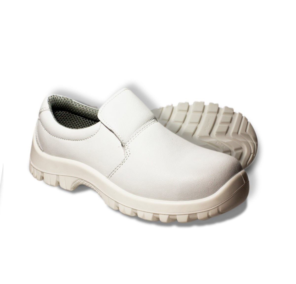 Calzado blanco de puntera metálica con cierre elástico y lengüeta. Goma para un mejor ajuste debajo de la lengüeta. Para uso en el sector alimentario. Material: Microfibra lavable. Suela: PU doble densidad, antiestática, resistente a hidrocarburos y antideslizante. Puntera metálica. Dibujo tipo AB. Color: Blanco. Tallas: 35/47.