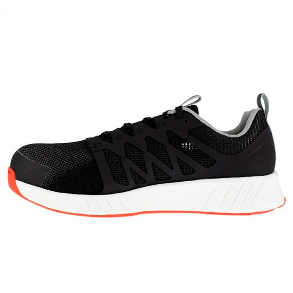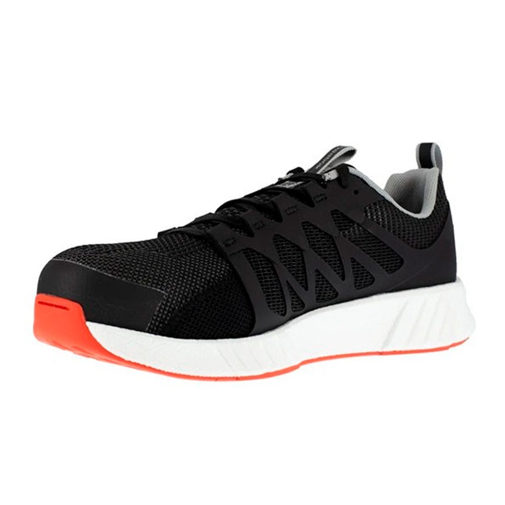 El calzado de seguridad Fusion Flexweave Safety IB1076 de norma S1P es ofrecido por la marca REEBOK. Este modelo predominantemente negro también es blanco y naranja, destinado a un público mixto.