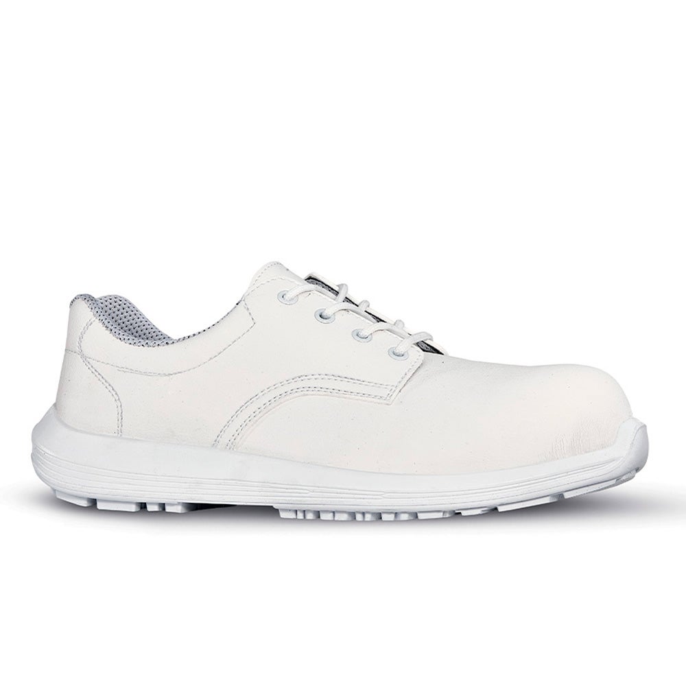 Zapatos de seguridad blancos bajos, cómodos y ligeros U-Power de la línea White68&Black, con empeine en microfibra Lucky, resistente a las bacterias y a los residuos químicos orgánicos, fácilmente lavable, puntal AirToe Composite, antideslizante y suela PU/PU U-Grip 68.