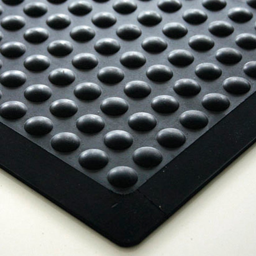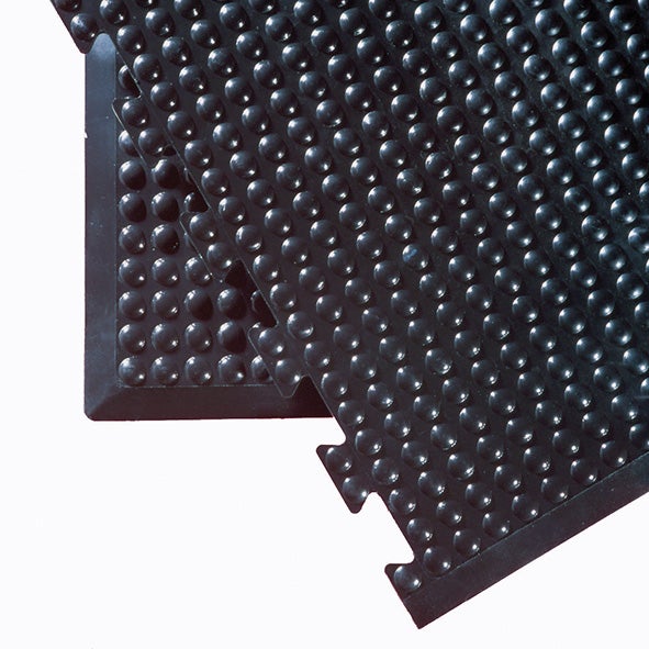 Fabricada em um resistente e confortável composto de borracha. Confortável para os pés, o que reduz a fadiga. A superfície de bolhas estimula a circulação sanguínea. Proteção contra pisos frios. Ideal para pessoas em uma posição estática. Disponível em tapete padrão (com bordas chanfradas) ou com seções centrais ou finais para montar tapetes mais longos.