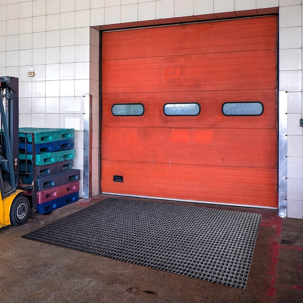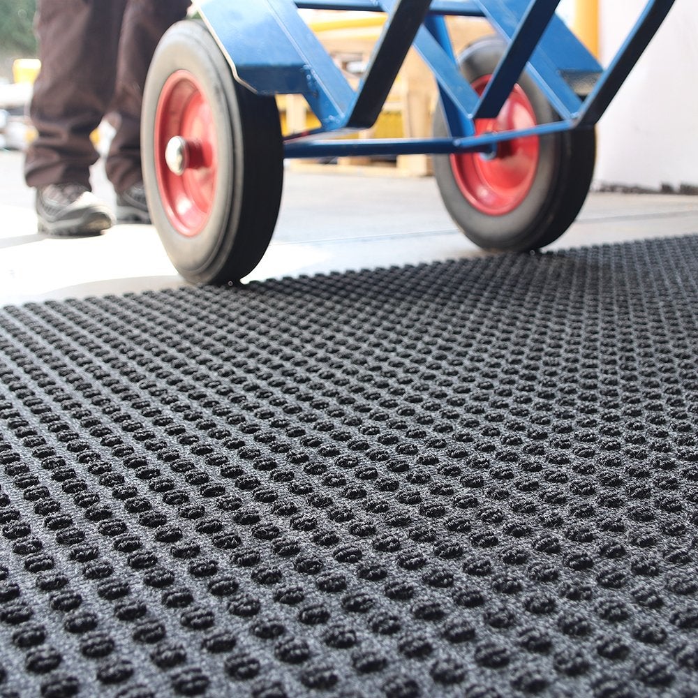 - O estampado em forma de grade absorve a umidade e remove a sujeira das rodas das carrinhos de mão.