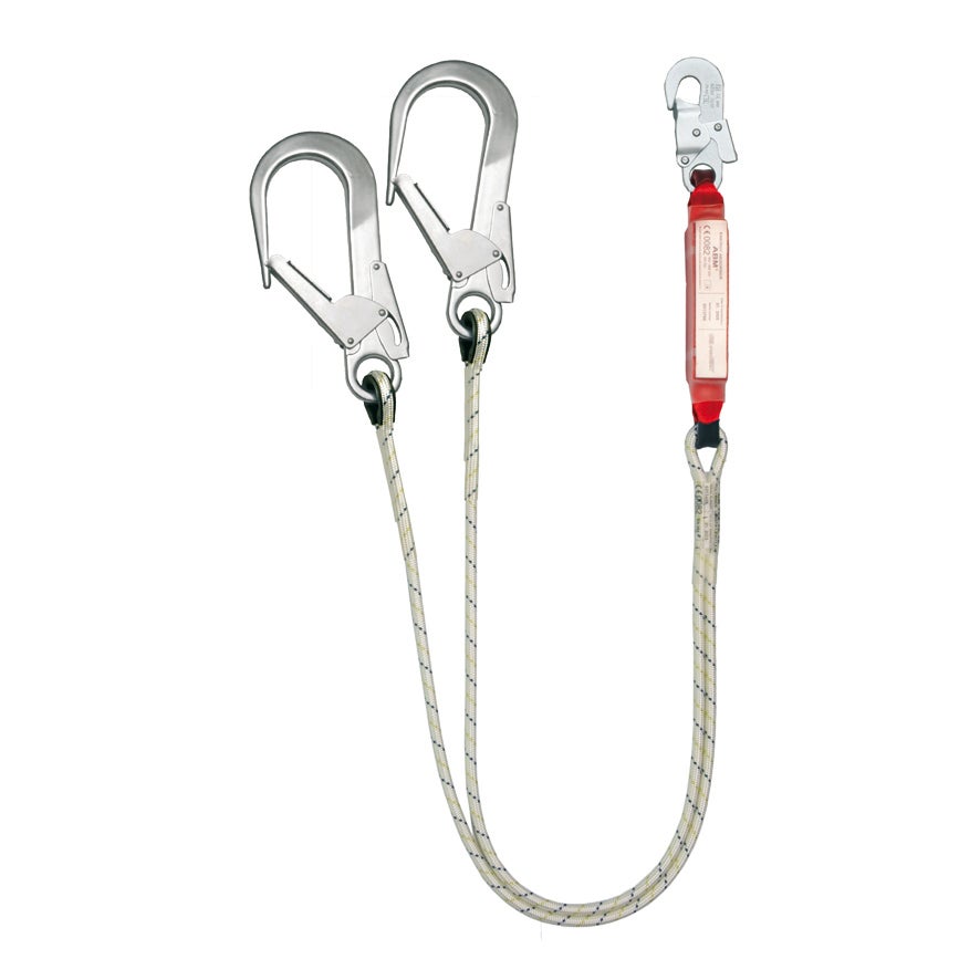 Elemento de amarra dupla com absorvedor de energia, fabricado com duas cordas de 10,5mm de diâmetro, equipado com ganchos de alumínio de 55mm de abertura e conector rápido para o arnês. Apto para quedas.