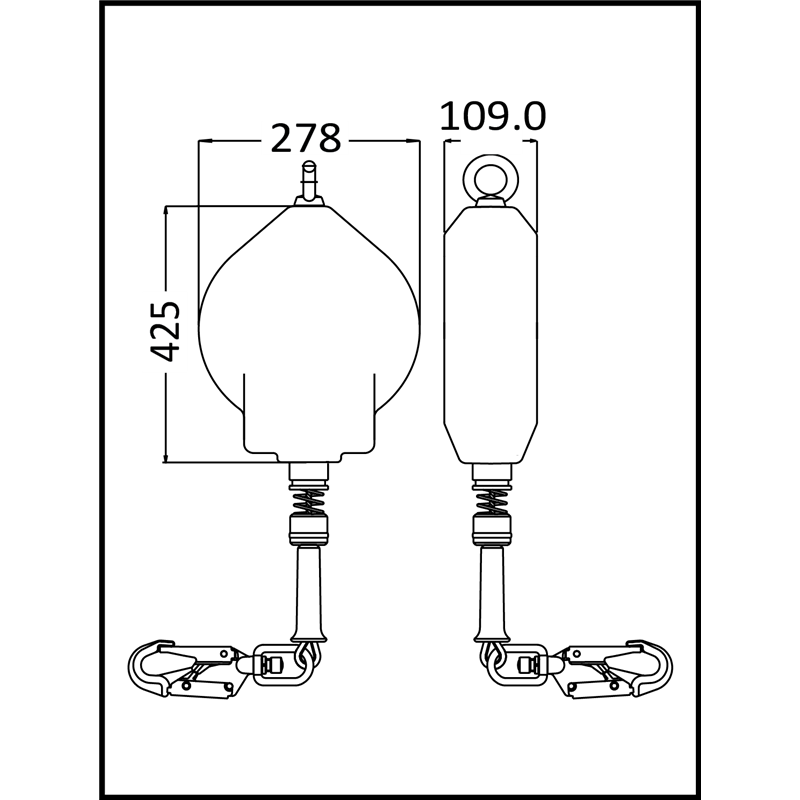 Anticaduta retrátil de 25 m com carcaça de polímero e cabo de aço galvanizado.