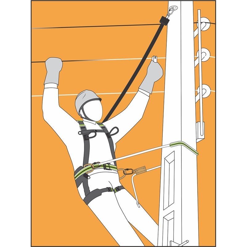 - Cabo de aço galvanizado diâmetro 4,5 mm, que integra: um conector FA 50 203 20 com indicador de queda; uma alça de agarrar.
