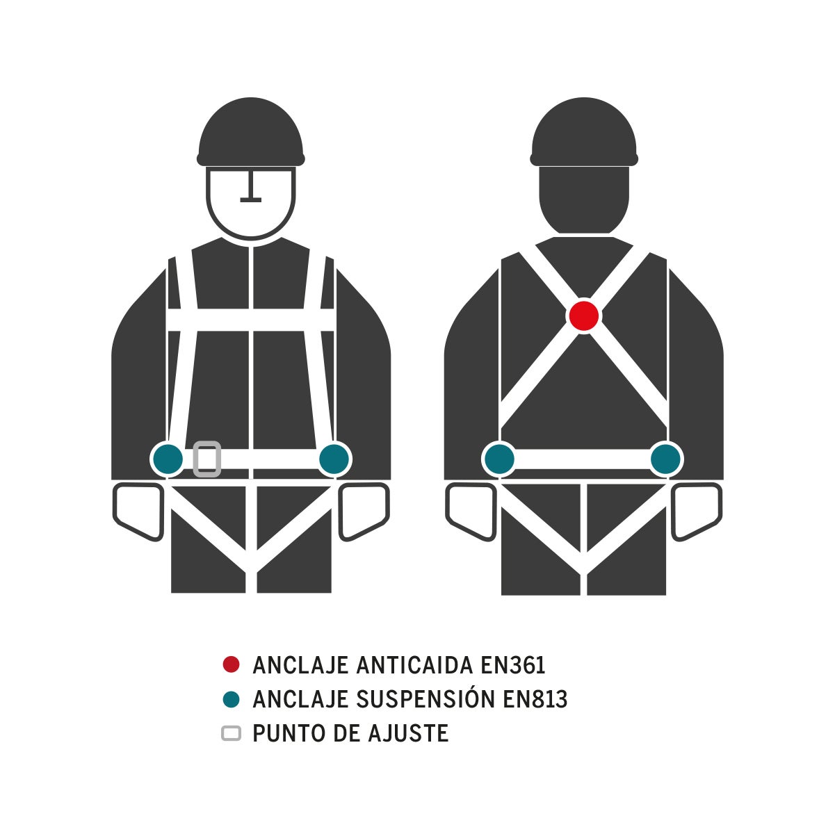 Arnês anticaídas com ponto de ancoragem dorsal e cinto de posicionamento incorporado. Fivelas ajustáveis nas coxas. Ajuste peitoral. Fabricado com fitas de 45mm.
