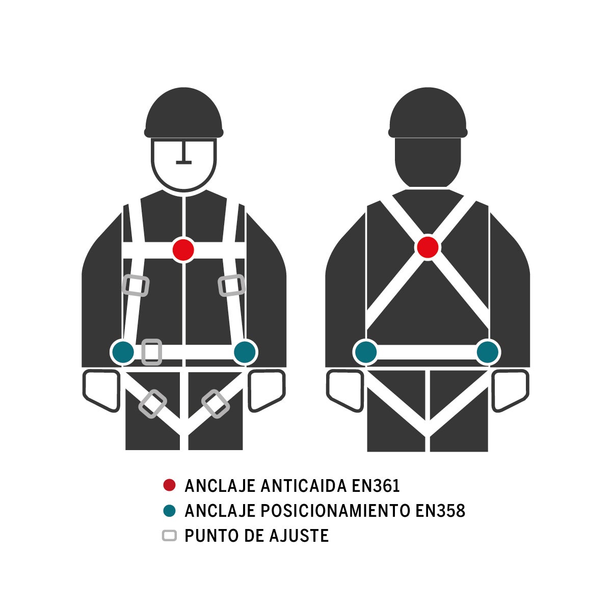 Arnês SOLDADOR com gancho dorsal e esternal. Fabricado com tiras de aramida-poliéster. Ajustável nos ombros e coxas. Fita subglútea. Inclui cinto de posicionamento e bolsa para arnês. Possibilidade de colete de tecido ignífugo com bolsos (ref. C427). Usuários de até 140 Kg.