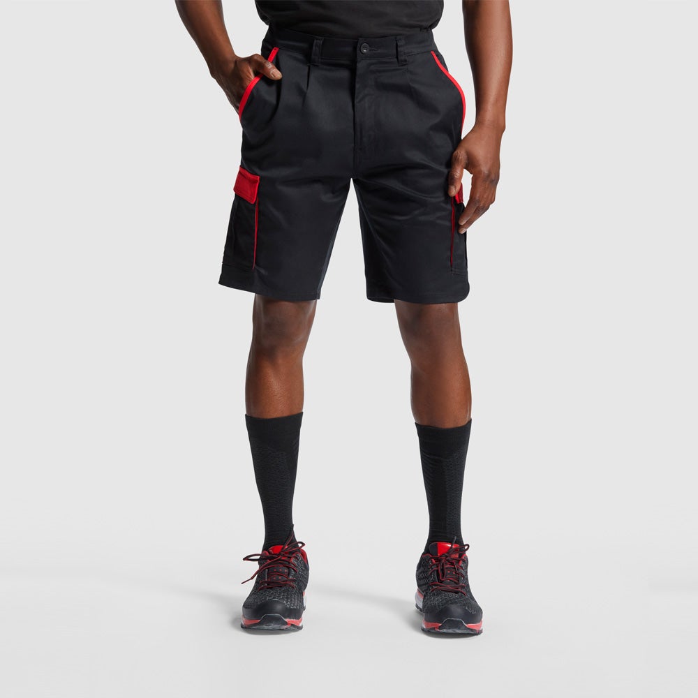 Dois bolsos laterais de pregas com aba e fechamento em velcro. 65% poliéster / 33% algodão / 2% elastano, sarja, 250 g/m².