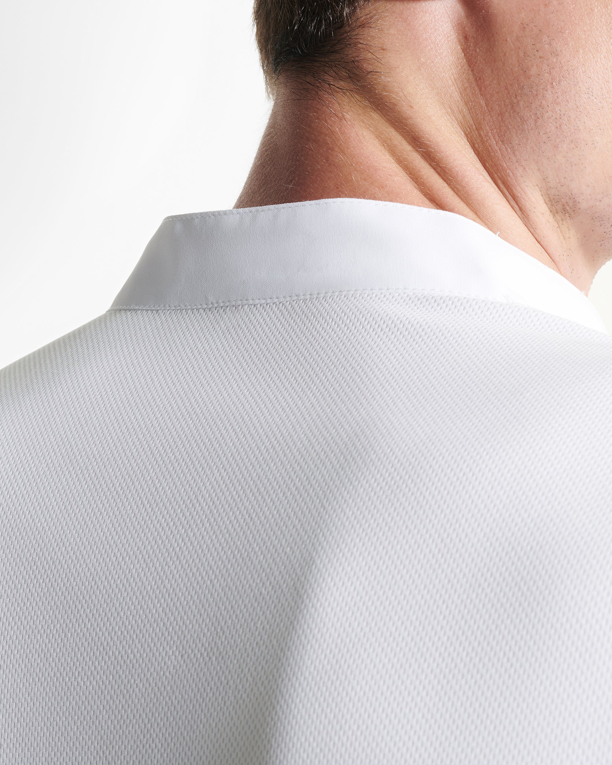 Colarinho tirilla e manga tipo alfaiate com bainha nos punhos.