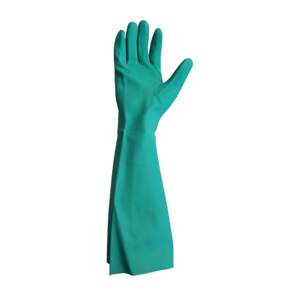 Luva sem suporte de nitrilo acetinado na cor verde, comprimento de 46 cm. EPI de categoria III. Boa resistência à abrasão para garantir um uso duradouro e exigente, resistência a diversos compostos químicos (ver descrição), além de a bactérias e fungos.