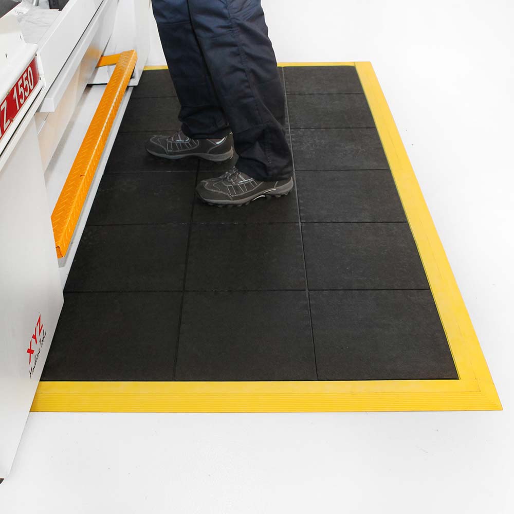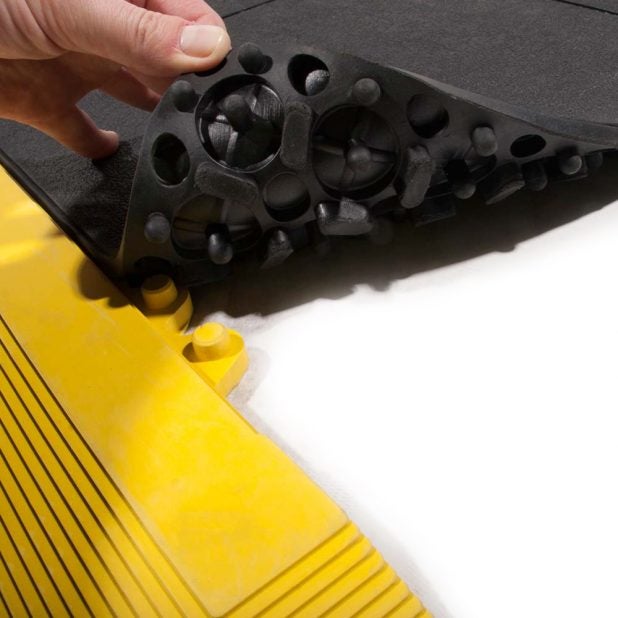 Placas interconectáveis fabricadas com uma mistura de borracha natural e nitrilo. Boa resistência a gorduras e óleos. Proporciona um efeito almofada sob os pés, oferecendo grande alívio e reduzindo a fadiga. Design alveolar para reduzir o efeito das vibrações.