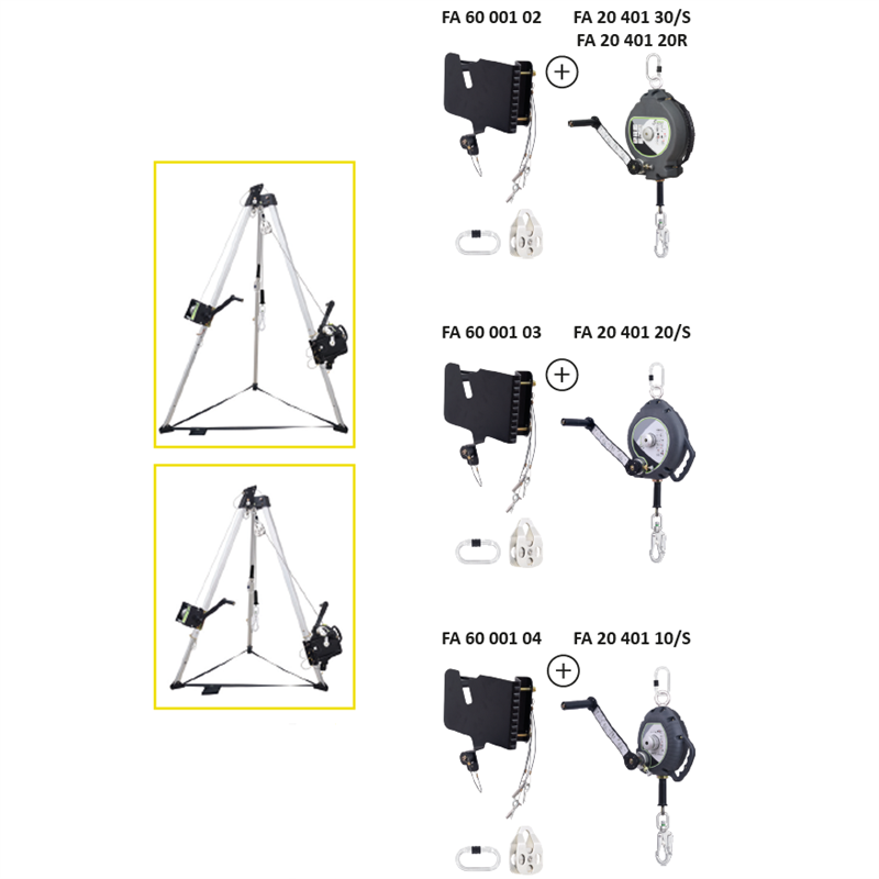 O tripé é fornecido com uma placa que permite instalar o guincho FA 60 003 20 / FA 60 003 30 / FA 60 023 20 / FA 60 023 20R.