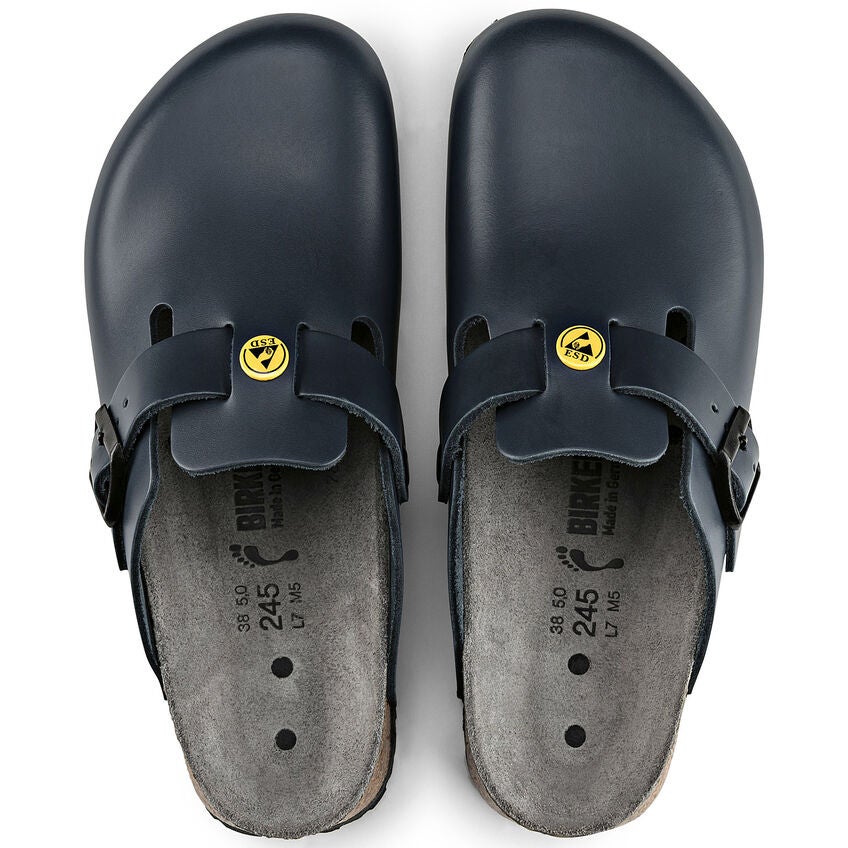 O Boston ESD oferece uma combinação ideal entre estética clássica e confiabilidade na proteção contra descargas eletrostáticas. Sua confecção especial para ambientes ESD protege assim pessoas e materiais em ambientes muito sensíveis, como o trabalho com semicondutores. Todos os modelos ESD da BIRKENSTOCK são testados de acordo com as diretrizes da norma DIN EN 61340 e atendem aos requisitos para áreas ESD de 1,0 x 105 até 3,5 x 107 Ohm.