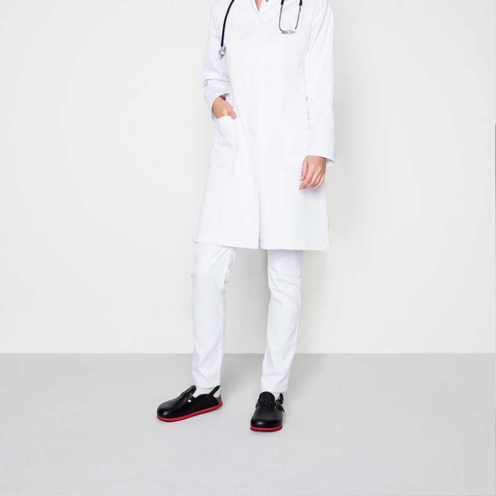 Nos modelos confeccionados com couro, a entressola de EVA conta com acolchoamento macio adicional. Pode-se confiar que amortecerá por muito tempo cada passo que dermos, também no caso de pés sensíveis. Este alto grau de flexibilidade e segurança ao caminhar são fatores particularmente demandados no campo médico. Todos os modelos de solas de uso especial estão comprovados de acordo com as diretrizes da norma EN ISO 20347:2012 em relação às propriedades antiderrapantes.