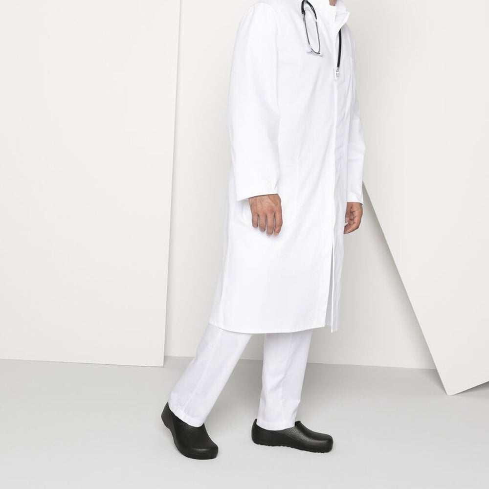 A sola de PU antiderrapante se revela como uma solução ótima especialmente ao caminhar sobre pavimentos lisos. Em hospitais, instalações da indústria alimentícia e cozinhas, o Profi Birki é a escolha preferida do pessoal experiente. A isso contribuem também suas excepcionais propriedades higiênicas: o tamanco, resistente a óleos e gorduras, pode ser lavado a temperaturas de até 80 °C e desinfetado; enquanto a palmilha removível de PU suporta temperaturas de até 60 °C. Todos os modelos Profi Birki possuem certificação conforme a norma EN ISO 20347:2012 OB E (categoria SRB).