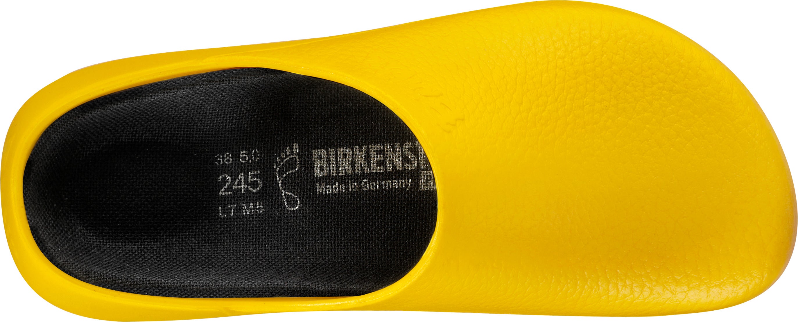 A grande seleção de cores disponível para Super Birki deixa clara a diversidade de usos que admite em ambientes profissionais e privados. Sua forma compacta é fabricada em poliuretano repelente à água e à sujeira, além de ser resistente a óleos e gorduras.